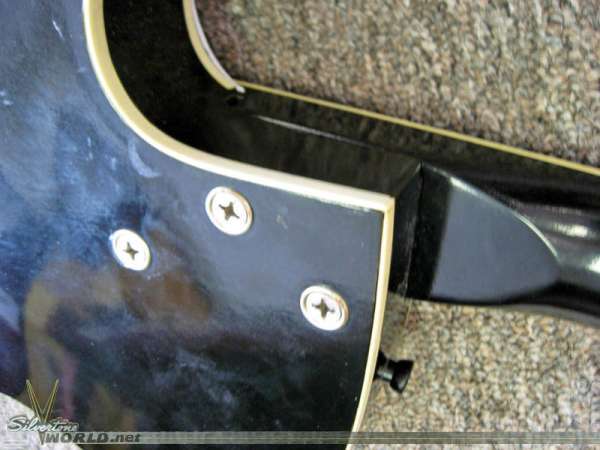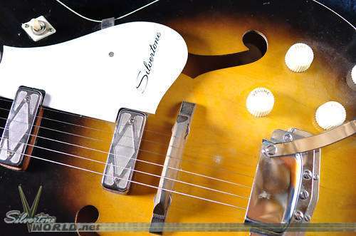snazzy cursive logo'd pickguard and a 'true vibrato' tailpiece (the same whammy