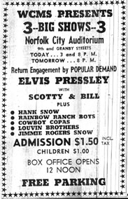 the bill. The resentment from the country establishment towards this weird new music and its bumping, grinding protostar was building, and some of this friction began to smolder when Elvis and some others wanted to cruise downtown in some rented convertibles to advertise the three shows. Hank Snow and his entourage refused to participate, exchanging words on Granby Street with Elvis and his band members and then going to see a movie. By now, the Colonel was managing the money that Elvis generated, and felt 'rooked' at the payment for the three performances. Ahh, the Colonel... |