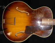 658 Kay FHAC w/ OC G $80 Clean, light wear, logo strong, striping looks good, neck pulling away a bit, pickguard present, block markers indicate pre-'66 model.