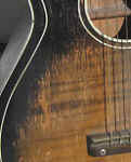 UNK Harmony FHAC F $76 Wear (water damage?) to top, pickguard missing, fret markers worn, some finish flaking, crack at neck and tailpiece