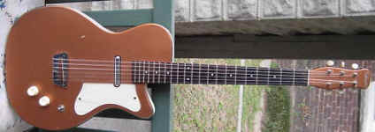 1448 Dano  SSEG guitar only G $225 Light wear, oxidation to tuner post tips, rust to screws and jack nut,  logo strong. This is a transitional setup; strip tuners, triangle knob inserts, 3-bolt neck. Is that glitter/sparkles on the pickguard, or overspray?
